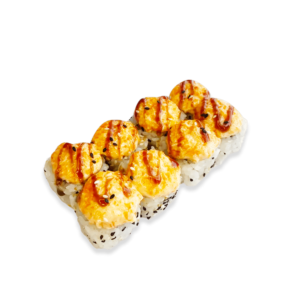Лосось, краб, сливочный сыр, огурец, черно-белый кунжут, Яки соус, унаги соус, сырный соус, кунжут