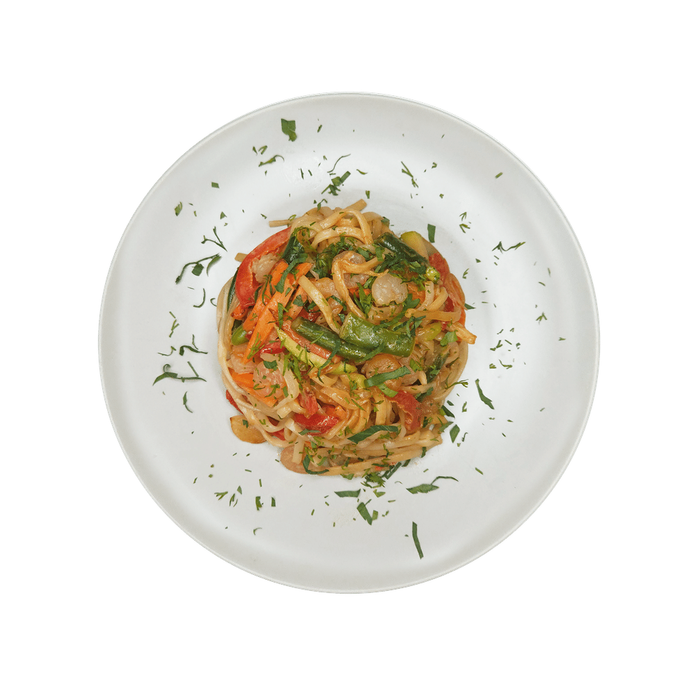 Удон, креветка, лук репчатый, морковь, перец болгарский, кабачок, сливочный соус, лук зеленый, сыр Пармезан