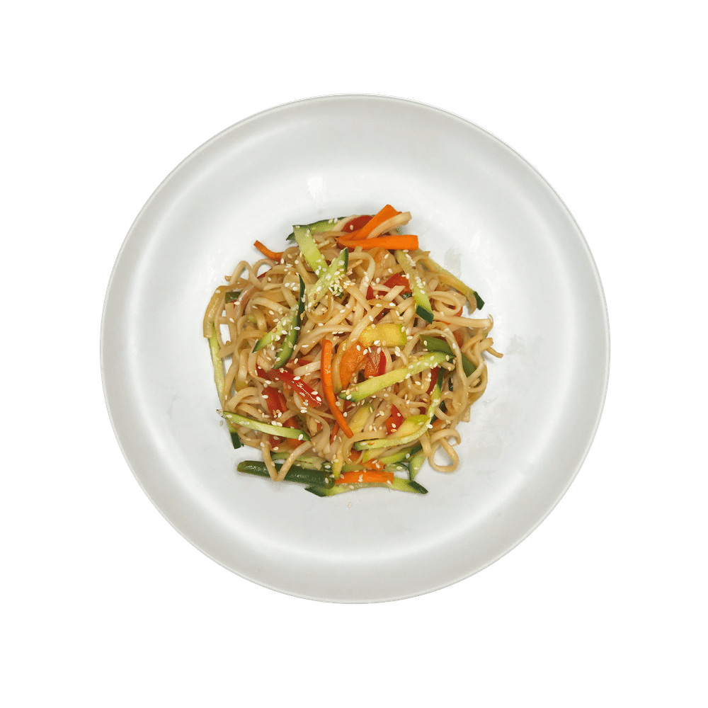 Удон, морковь, лук репчатый, перец болгарский, кабачок, фасоль стручковая, огурец, кунжут, соевый соус