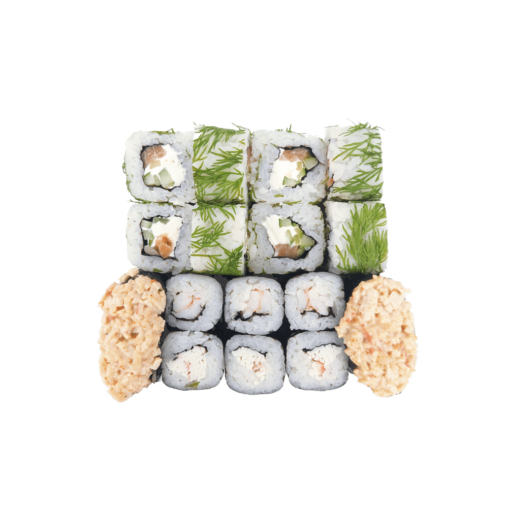 Зеленая река, 1/2 Ролл с креветкой, 1/2 ролл с крабом, суши Острый краб 2шт.